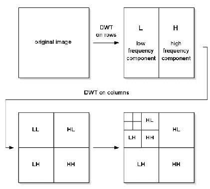Na obrázku 3 je znázorněn příklad dvouúrovňové 2D vlnkové transformace, vznikající rekurzivním průchodem bankami filtrů, což umožňuje jednoduchou realizaci libovolného množství průchodů.